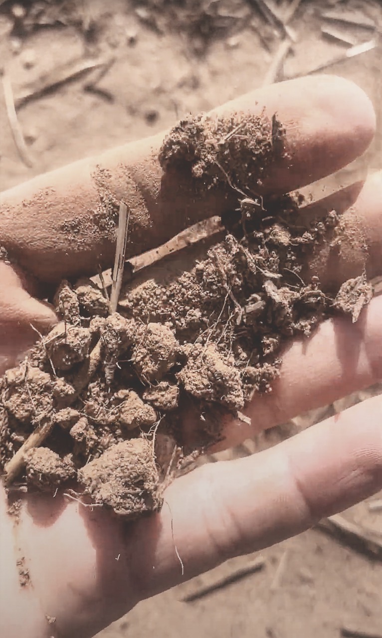 Pictured below is dirt from our North 40 acres, the season after we took it out of wheat production, before we started running animals through it. This could just as easily be dirt from a pristine suburban lawn as a Kansas wheat field, mined to exhaustion for the last century. The deal is, when you till or plow every year, spray to kill all but one type of plant, spray to temporarily spike nitrogen, and spray to kill bugs, this is what happens. Everything living dies, and all organic matter, stockpiled for millennia, gets washed away.