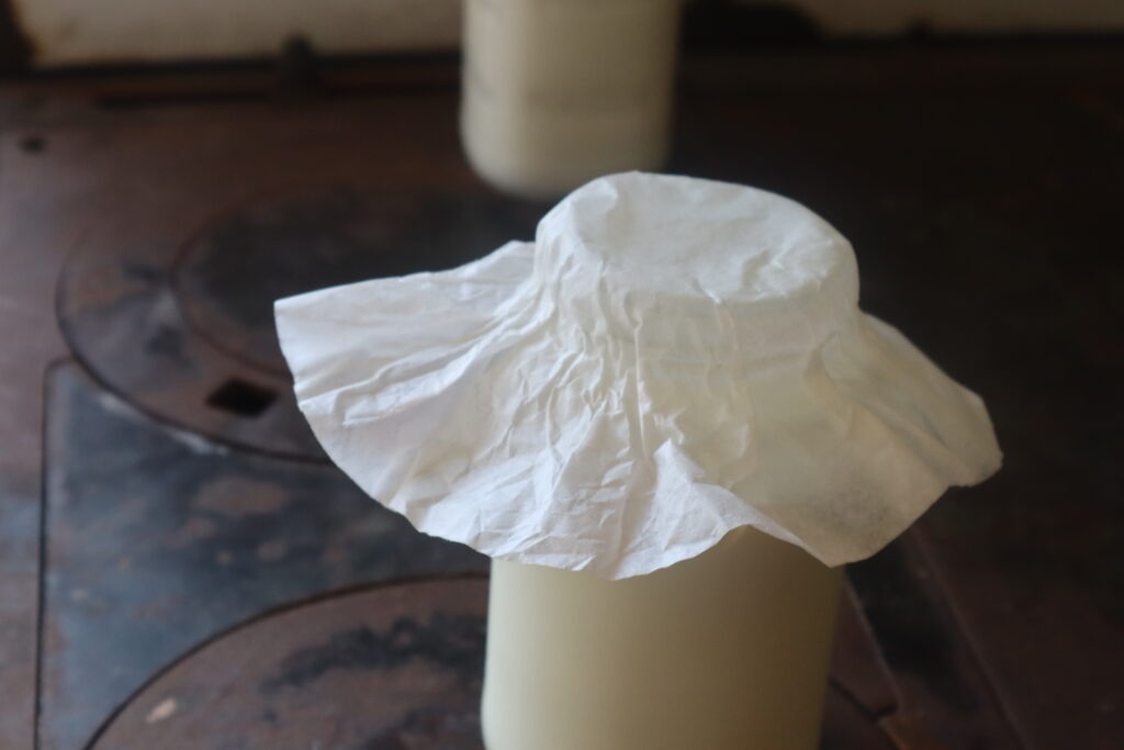After milking, she is pitched fresh hay, the ice in the water trough is broken and scooped out, and I am back to the house. The house is warm and cozy from the wood stove, and before I do anything, I peel off layers of barn clothes, suddenly claustrophobic with the heat. The milk is strained into glass jars and most of it is placed in the fridge with the exception of a pint that I save to feed to my clabber culture.